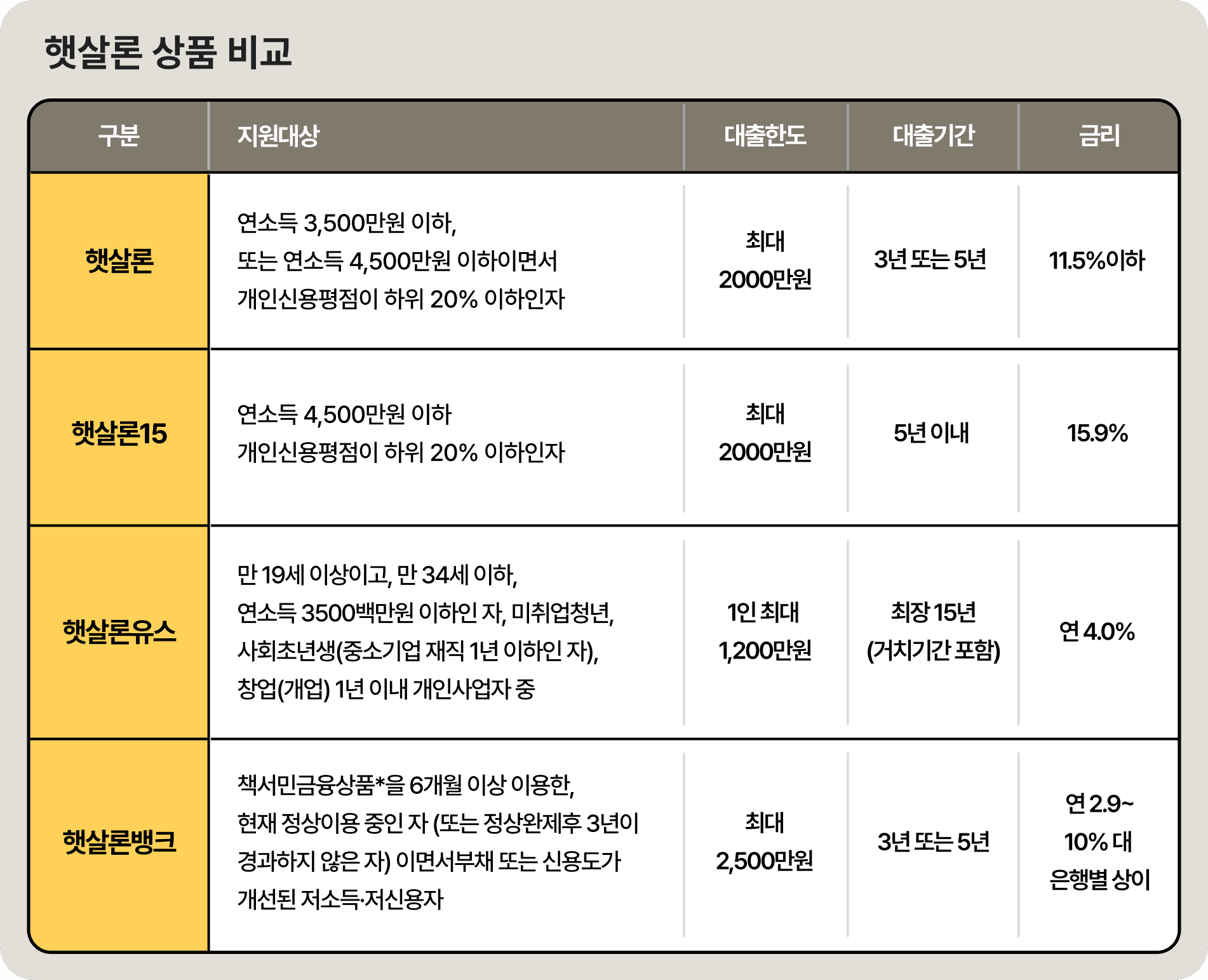 신용이 낮아도 나에게 맞는 대출은 반드시 있습니다. 햇살론 계열이 그중에서도 가장 안정적이고 확실한 선택지예요. 하지만 상품이 다양하고 조건이 다르기 때문에, 정확한 비교가 무엇보다 중요합니다.
